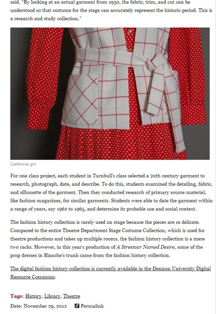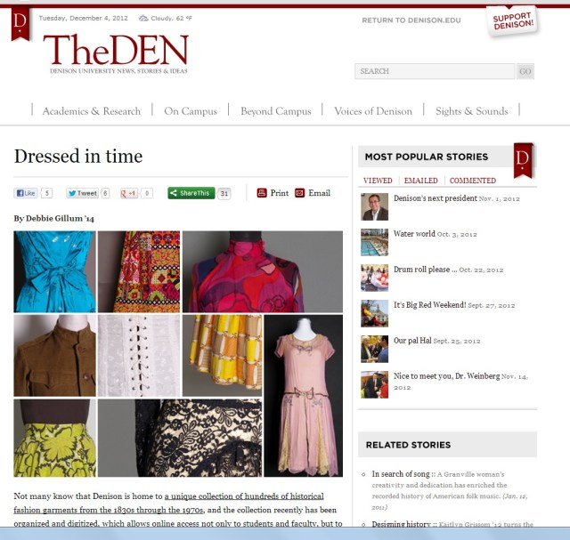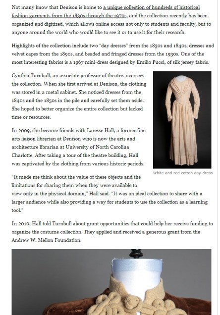 Not many know that Denison is home to a unique collection of hundreds of historical fashion garments from the 1830s through the 1970s, and the collection recently has been organized and digitized, which allows online access not only to students and faculty, but to anyone around the world who would like to see it or to use it for their research.