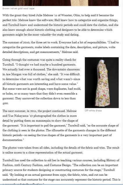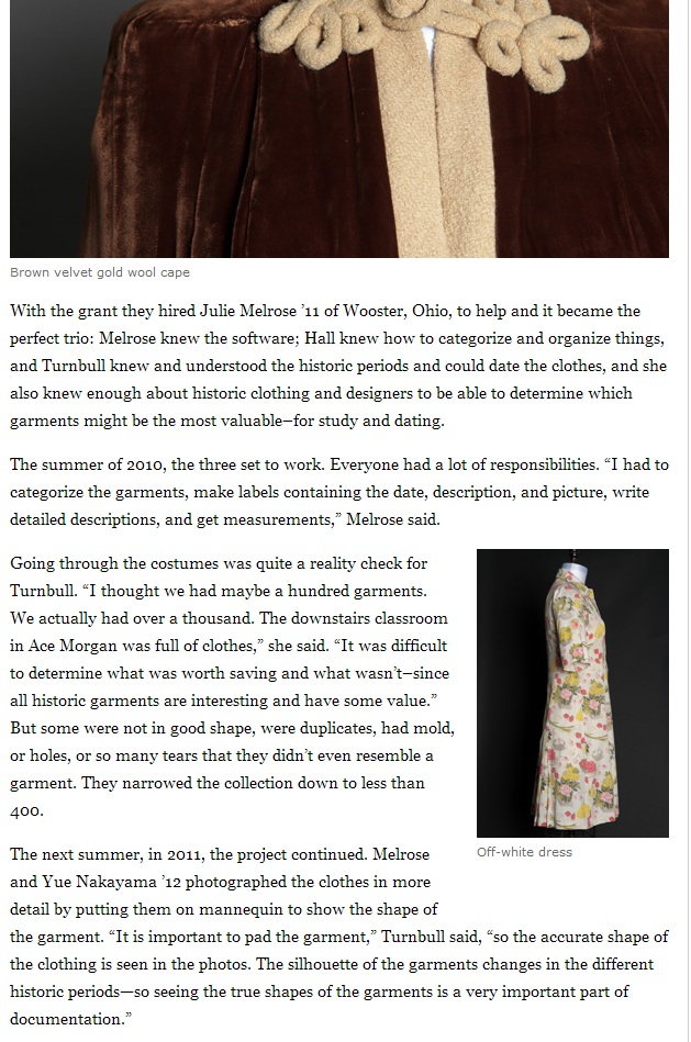 With the grant they hired Julie Melrose ’11 of Wooster, Ohio, to help and it became the perfect trio: Melrose knew the software; Hall knew how to categorize and organize things, and Turnbull knew and understood the historic periods and could date the clothes, and she also knew enough about historic clothing and designers to be able to determine which garments might be the most valuable–for study and dating.