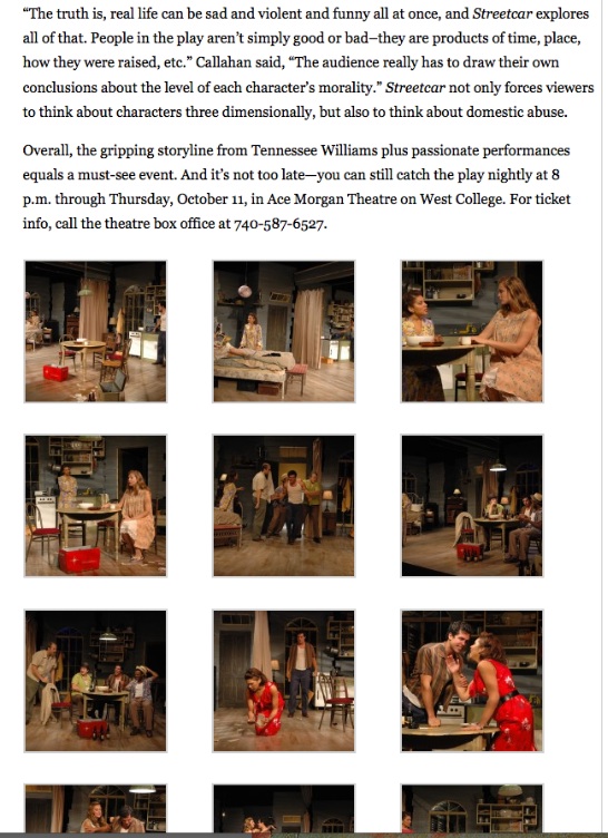 Overall, the gripping storyline from Tennessee Williams plus passionate performances equals a must-see event. And it’s not too late—you can still catch the play nightly at 8 p.m. through Thursday, October 11, in Ace Morgan Theatre on West College. For ticket info, call the theatre box office at 740-587-6527.