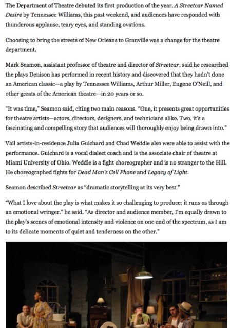 Mark Seamon, assistant professor of theatre and director of Streetcar, said he researched the plays Denison has performed in recent history and discovered that they hadn’t done an American classic—a play by Tennessee Williams, Arthur Miller, Eugene O’Neill, and other greats of the American theatre—in 20 years or so.