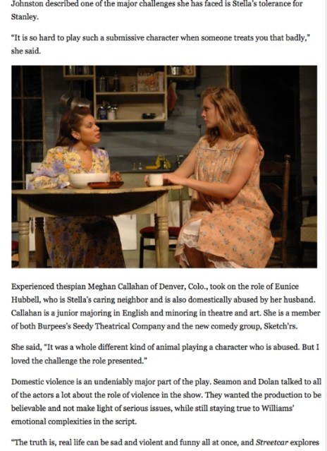Experienced thespian Meghan Callahan of Denver, Colo., took on the role of Eunice Hubbell, who is Stella’s caring neighbor and is also domestically abused by her husband. Callahan is a junior majoring in English and minoring in theatre and art. She is a member of both Burpees’s Seedy Theatrical Company and the new comedy group, Sketch’rs.