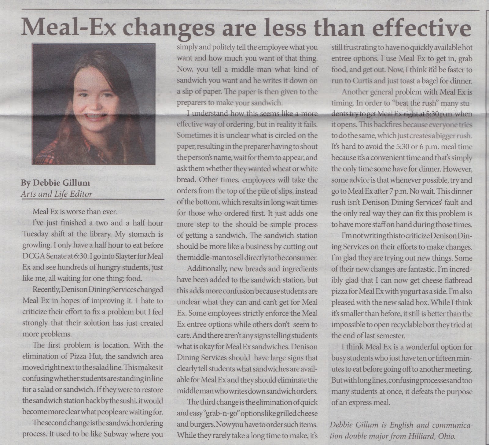 I was feeling fed up with our dining options on campus and wanted to express my ideas for making improvements because the improvements that were made starting this semester weren’t working.