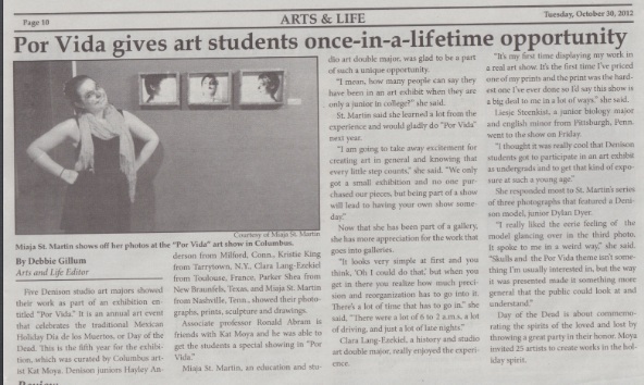 This article was in the Arts and Life section of the Oct 30 Denisonian. My roommate told me about the art show she was involved in and I wanted to cover it. I wish I had gotten more quotes in this article but the girls didn’t get back to me in time. We don’t normally cover art shows or art events so I was happy this made it into the paper.