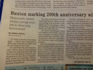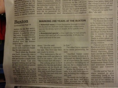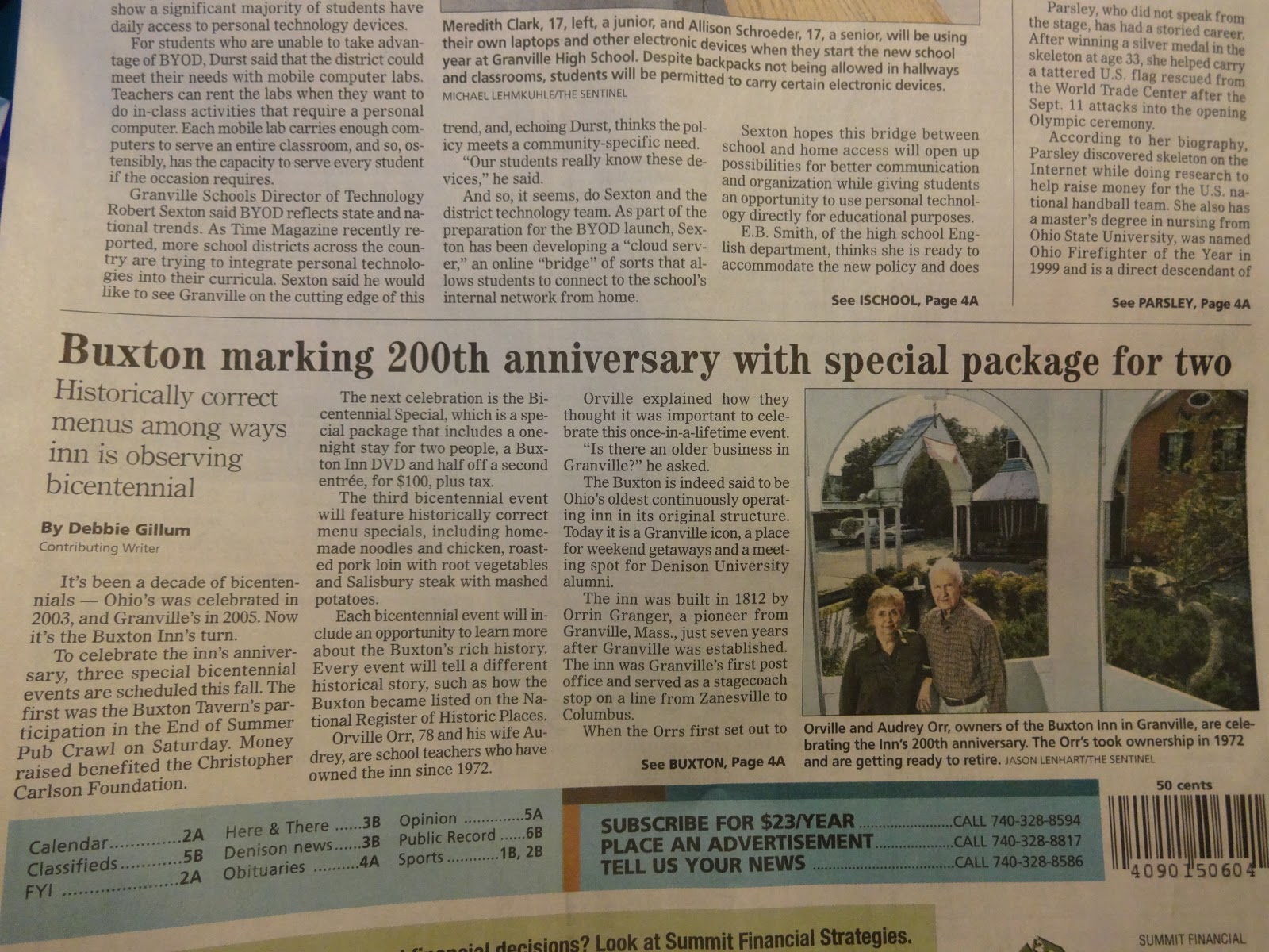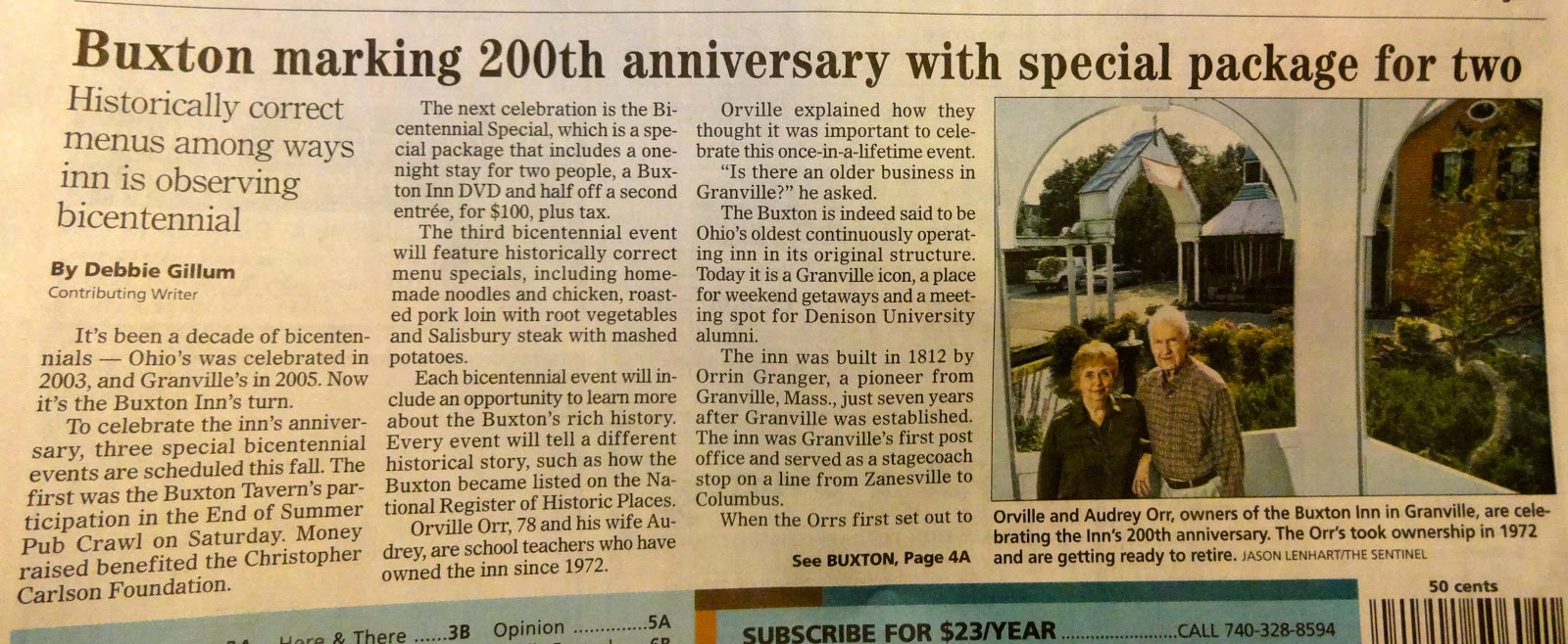 Granville, SentinelBuxton Inn January 10, 2013April 15, 2018 Debbie I wrote an article for the Granville Sentinel about the Buxton Inn’s bicentennial on Sept 6 2012. It ran on the front page. Share: Click to share on X (Opens in new window) X Click to share on Facebook (Opens in new window) Facebook Click to email a link to a friend (Opens in new window) Email Click to print (Opens in new window) Print Click to share on LinkedIn (Opens in new window) LinkedIn Related
