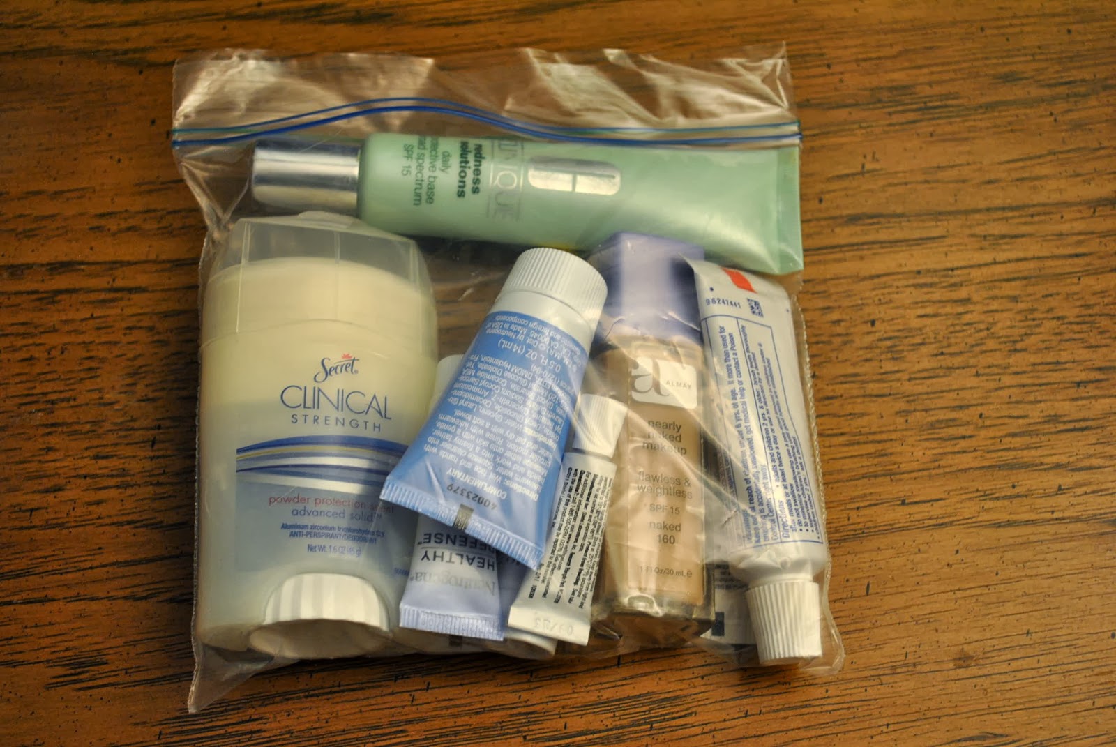 - Pack toiletries. If you’re flying and checking a bag, put all your liquids in that bag. If you’re not checking a bag, put liquids into a baggie and keep them under 3 oz. My dermatologist and dentist give out tiny samples that are perfectly travel size. Be sure to reminisce on the days before Sept. 11 when you could carry on any liquids you wanted.