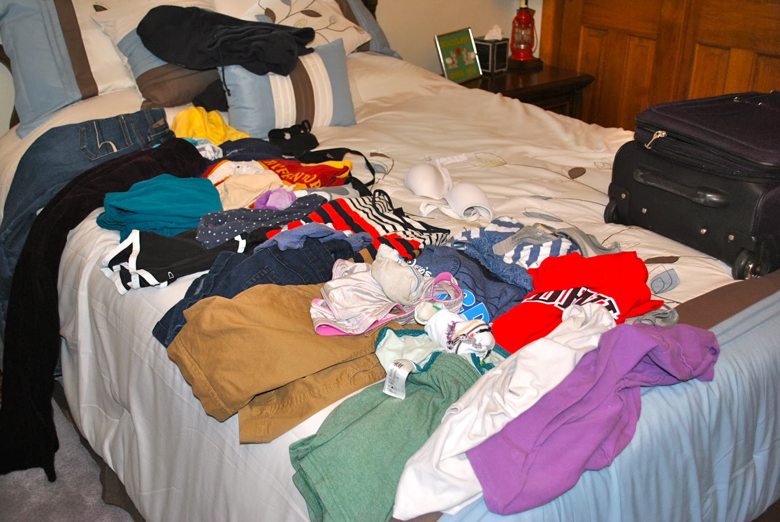 - Lay them out on your bed. Make piles for each day you’ll be away. This helps you visually check you’re packing shirts, pants, underwear, socks, shoes, bras, camisoles, etc for each day. Plus then it will look like you have six stylish friends laying on your bed.