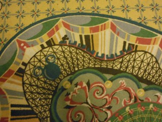 At the Boardwalk resort, Mickey is in the carpet riding a roller coaster.