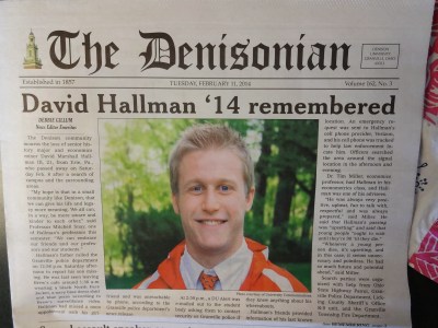 The Denison community mourns the loss of senior history major and economics minor David Marshall Hallman III, 21, from Erie, Pa., who passed away on Saturday Feb. 8 after a search of campus and the surrounding areas.
