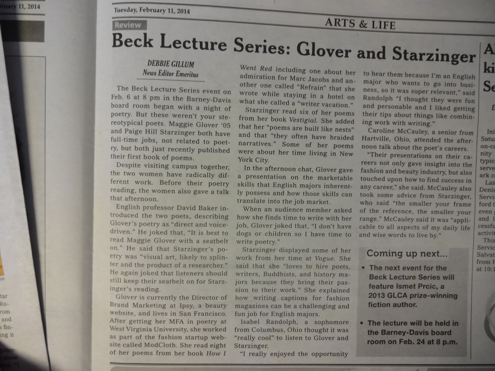 Glover is currently the Director of Brand Marketing at Ipsy, a beauty website, and lives in San Francisco. After getting her MFA in poetry at West Virginia University, she was part of the fashion startup website called ModCloth. She read eight of her poems from her book How I Went Red including one about her admiration for Marc Jacobs and another one called “Refrain” that she wrote while staying in a hotel on what she called a “writer vacation.”