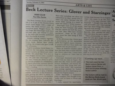 English professor David Baker introduced the two poets, describing Glover’s poetry was “direct and voice-driven.” He joked that, “It is best to read Maggie Glover with a seatbelt on.” He said that Starzinger’s poetry was “visual art, likely to splinter and the product of a researcher.” He again joked that listeners should still keep their seatbelt on for Starzinger’s reading.