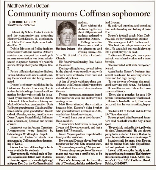 Dublin City School District students and the community are mourning Matthew Keith Dotson, 16, a sophomore at Dublin Coffman High School who died Tuesday, Dec. 2.