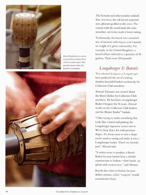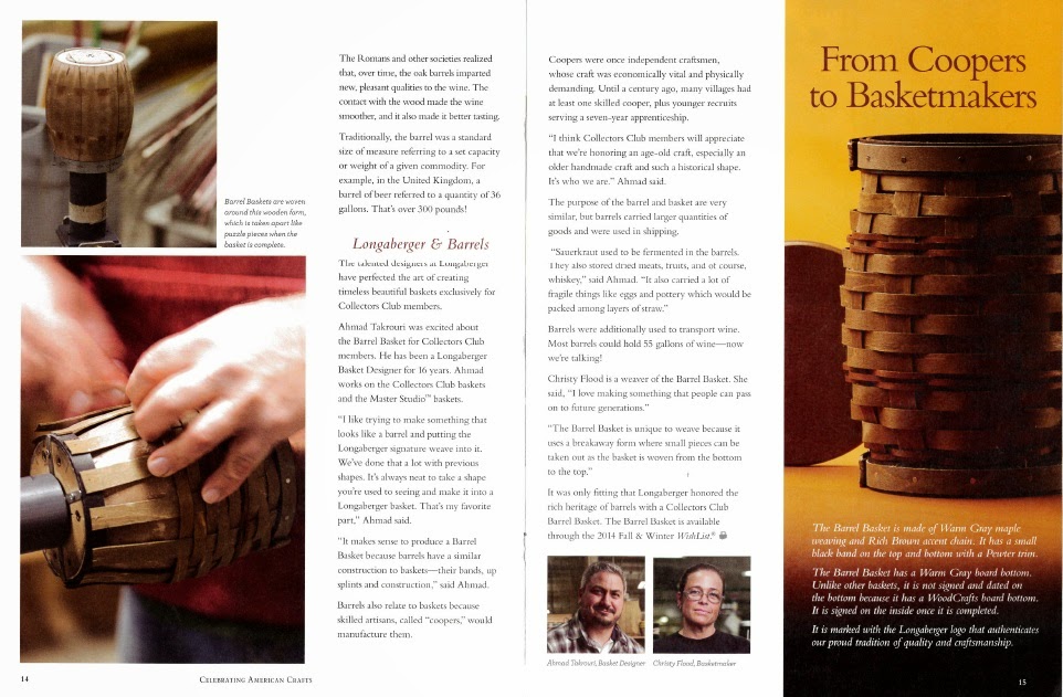 (I wrote this article for the Fall/ Winter Signatures magazine for Longaberger. I went out to The Homestead and interviewed both Ahmad and Christy about the barrel basket. I enjoyed researching the history of barrels and learning how a basket evolves from being just an idea to a real basket. I’m proud of how factual this article is and the playful tone it has when referring to how much wine barrels can hold. I have included scanned images of the article from Signatures.)