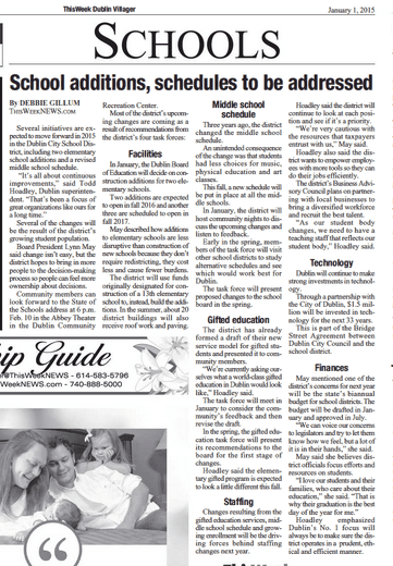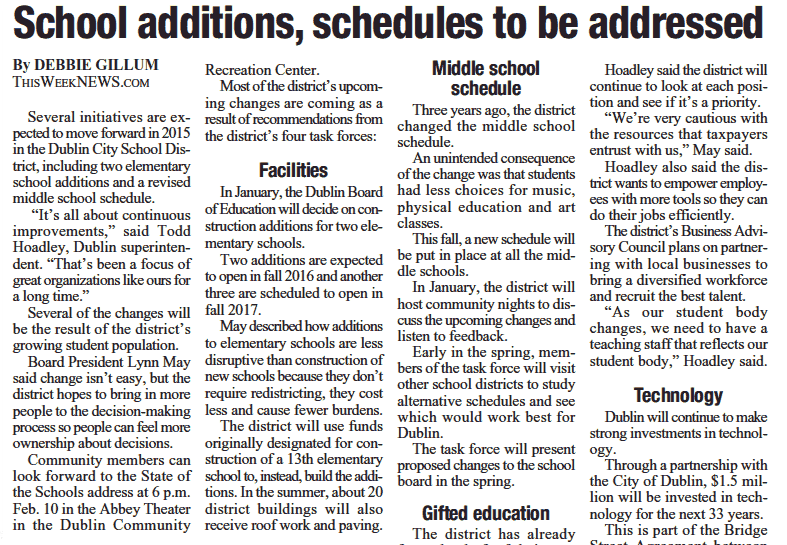 Several initiatives are expected to move forward in 2015 in the Dublin City School District, including two elementary school additions and a revised middle school schedule.