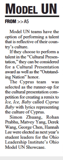 Simon Zhuang, Rohan Prabhu, Matvey Yang, Derek Wang, George Chen, Hannah Lee were elected as next year’s student leaders for the Ohio Leadership Institute’s Ohio Model UN Showcase.