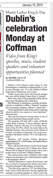 Dublin’s 2015 Martin Luther King Jr. Day Remembrance Celebration is planned from 11 a.m. to noon Monday, Jan. 19, in the Dublin Coffman High School Performing Arts Center.