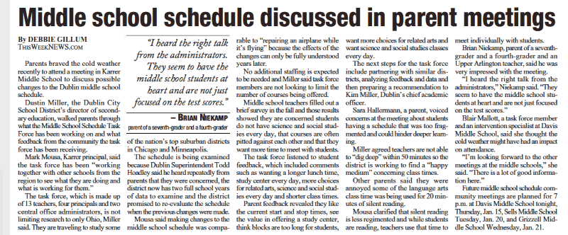 Parents braved the cold weather recently to attend a meeting in Karrer Middle School to discuss possible changes to the Dublin middle school schedule.