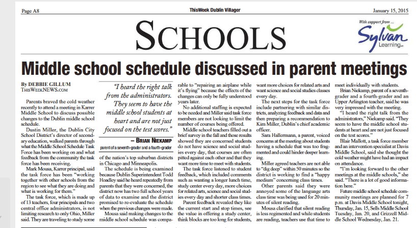 “I heard the right talk from the administrators,” Niekamp said. “They seem to have the middle school students at heart and are not just focused on the test scores.”