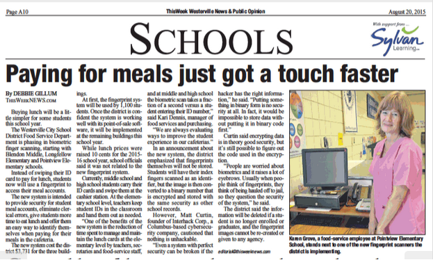 The Westerville City School District Food Service Department is phasing in biometric finger scanning, starting with Blendon Middle, Longfellow Elementary and Pointview Elementary schools.