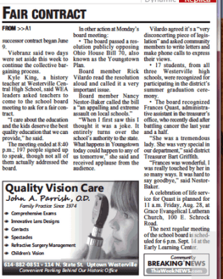 Kyle King, a history teacher at Westerville Central High School, said WEA leaders asked teachers to come to the school board meeting to ask for a fair contract.