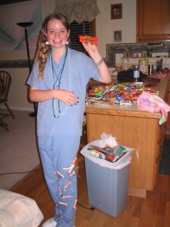 We went to Wal-Mart and bought white sweatshirts, plastic silverware, red paint/ fake blood, puffy T-shirt paint and little cereal boxes. We went back to her house and had a lot of fun making the sweatshirts. Everyone loved our costume.