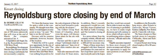 “I think this will be a great new opportunity for the city of Reynoldsburg,” he said. “The Kmart is in a great location between Brice and Main Street. I see nothing but positives for the redevelopment of that site and we look forward to working with the developers.”
