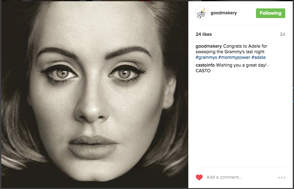 I watched Adele sweep the Grammy’s on Sunday and so I wanted to celebrate her achievement on Instagram and provide relatable down-to-earth content for our Instagram followers. This is Adele’s Twitter profile picture and I wrote the caption.
