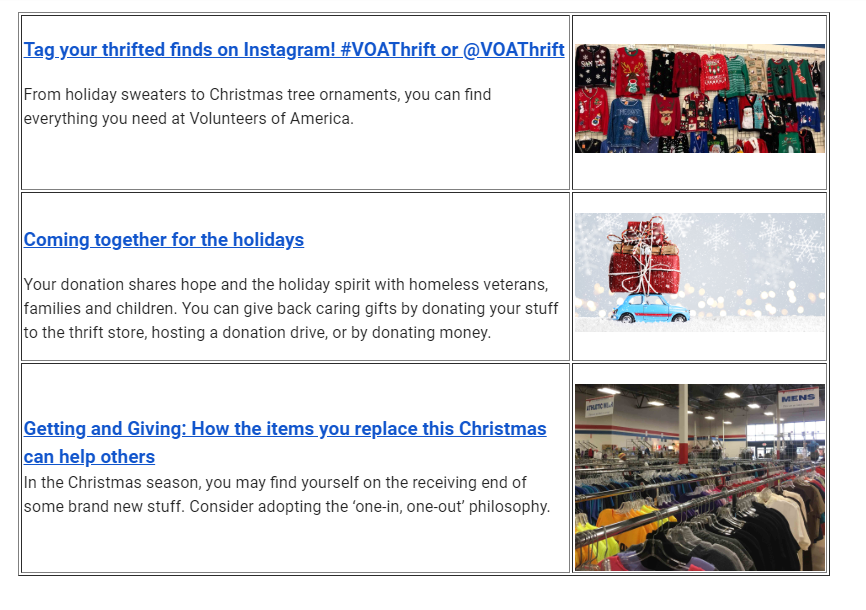 I wanted to share this monthly thrift email newsletter that I sent out this morning. I needed to let our subscribers know when we’ll be closed and that our sale date is changing this month. I kept it fun by updating the top banner for the holidays. Debbie looks good in a Santa hat.