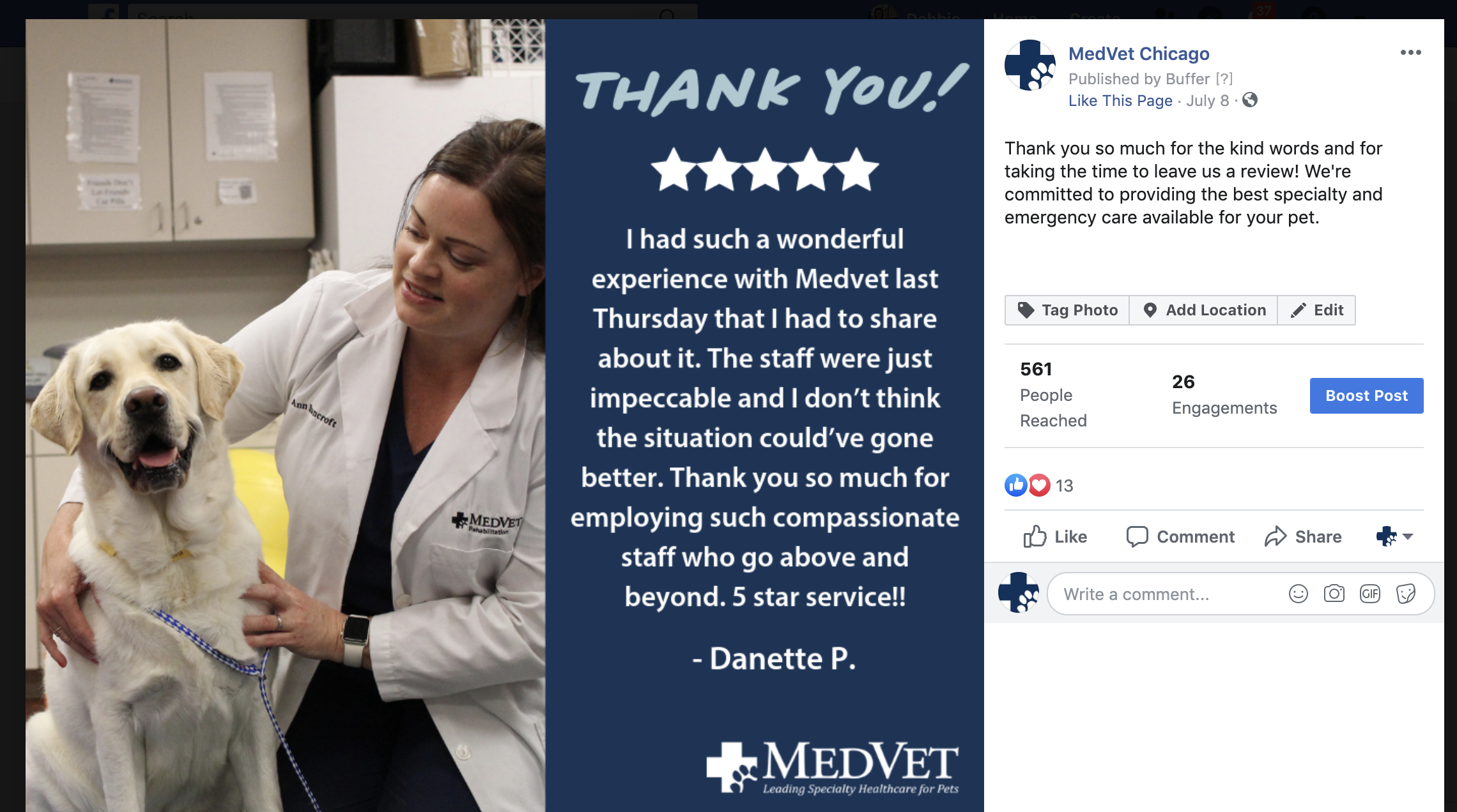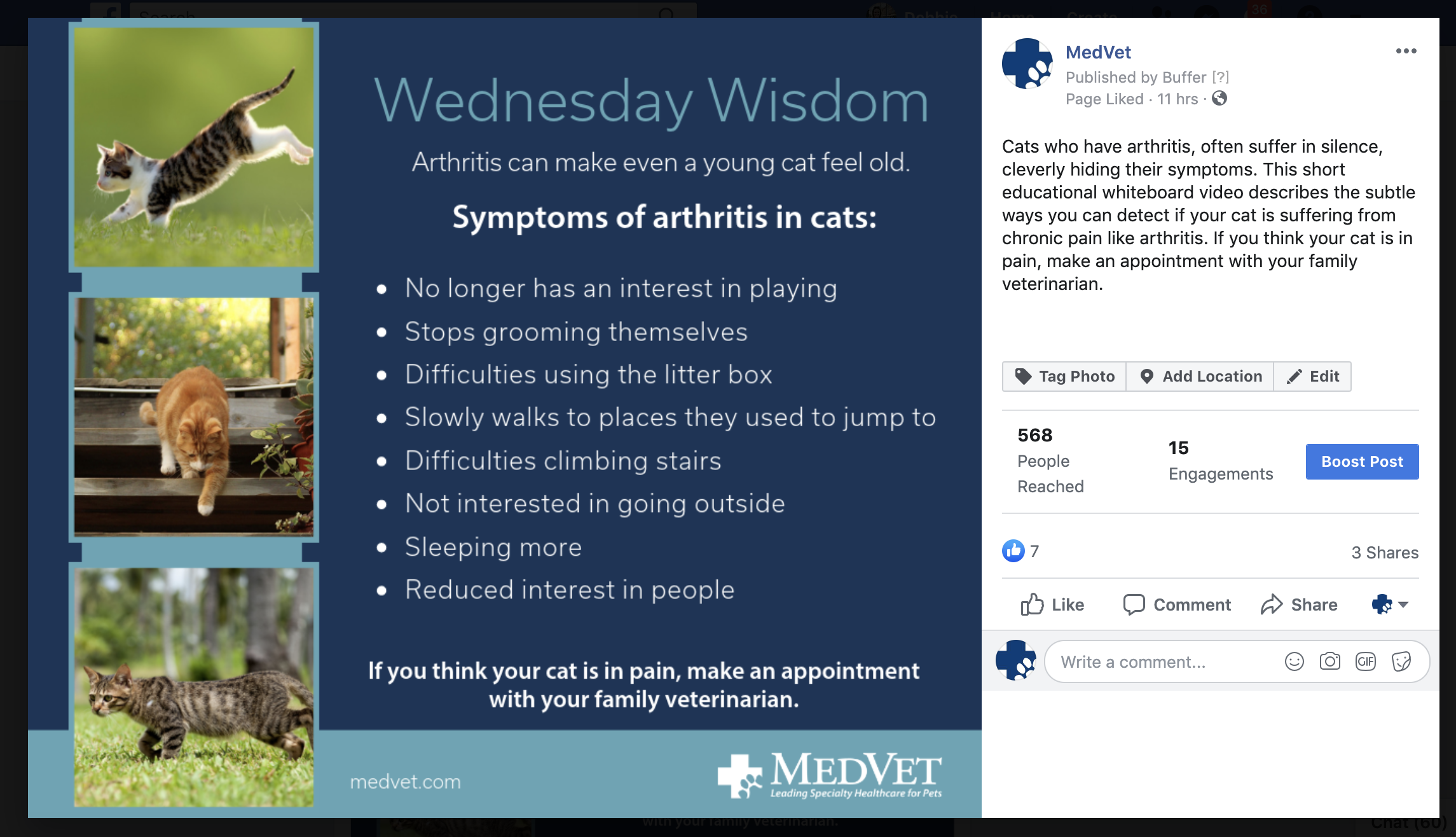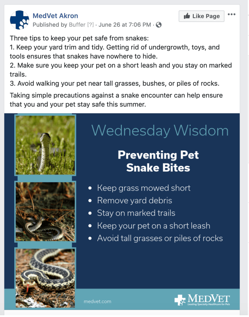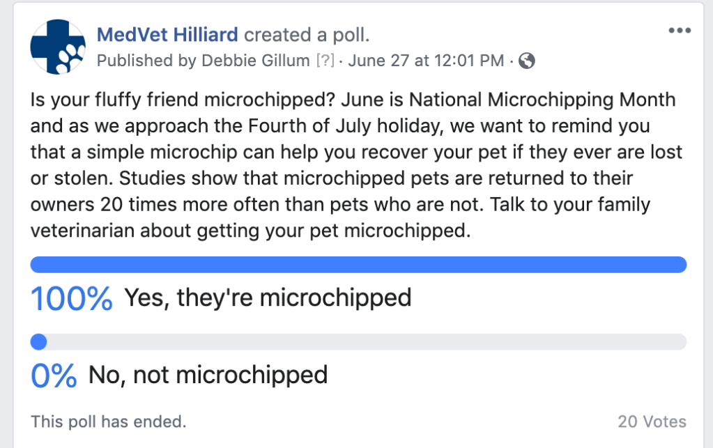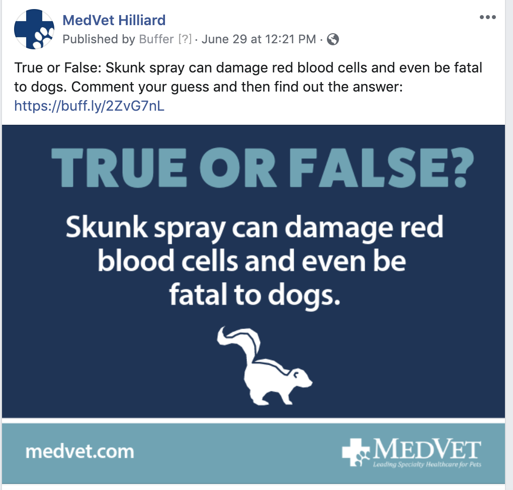 I’m proud to share some of the Facebook posts that I created for all of the 24 MedVet Facebook pages recently. My goal with the content creation has been to engage our audience while still maintaining our commitment to leading specialty healthcare for pets. I’m learning that our audience loves to interact with us, whether it’s sharing pet photos or answering our questions. I made these graphics in Canva and wrote the copy.