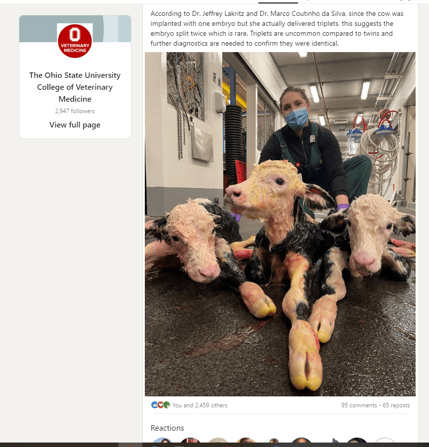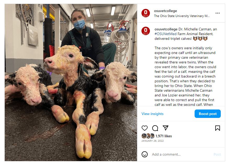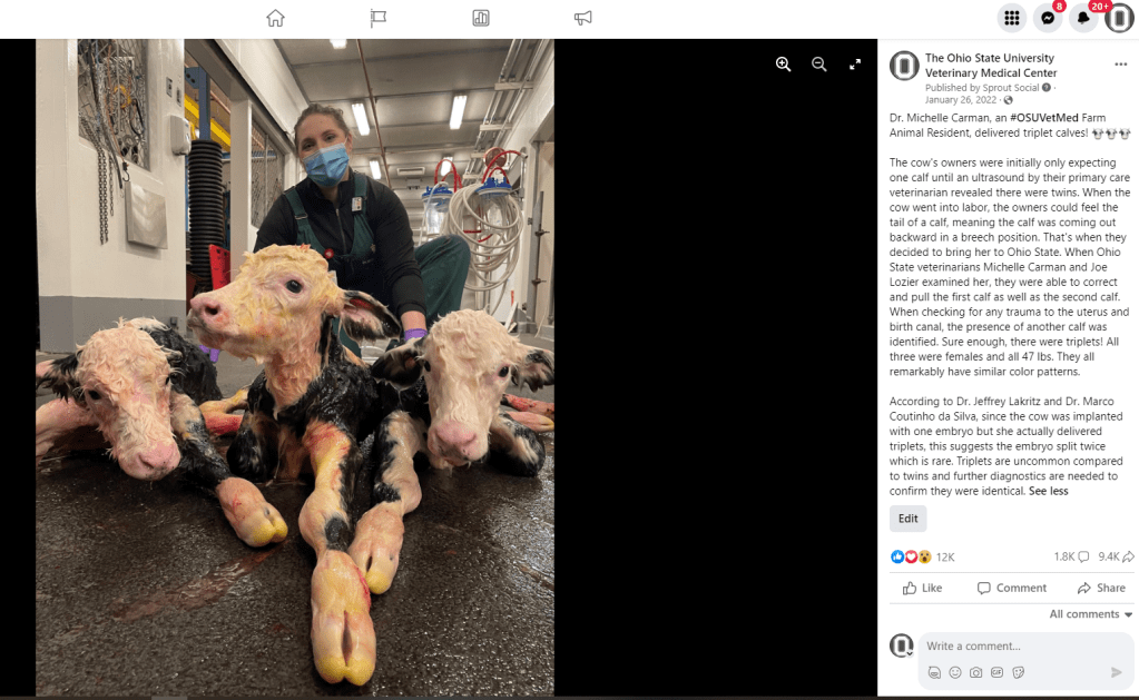 I managed a viral social media post in January 2022 at The Ohio State University College of Veterinary Medicine. I worked with stakeholders to find out about the calves being born. I summarized the information, crafted a draft, and showed the doctor to ensure that the content was accurate. When the post went viral, I immediately shared metrics. The post had 264,628 engagements on the VMC FB, 2,129 engagements on IG, and 5,465 engagements on LinkedIn. The post was shared in our alumni email newsletter called Connect, the Veterinary Medical Center Newsletter, and in a Farm Animal donor email.