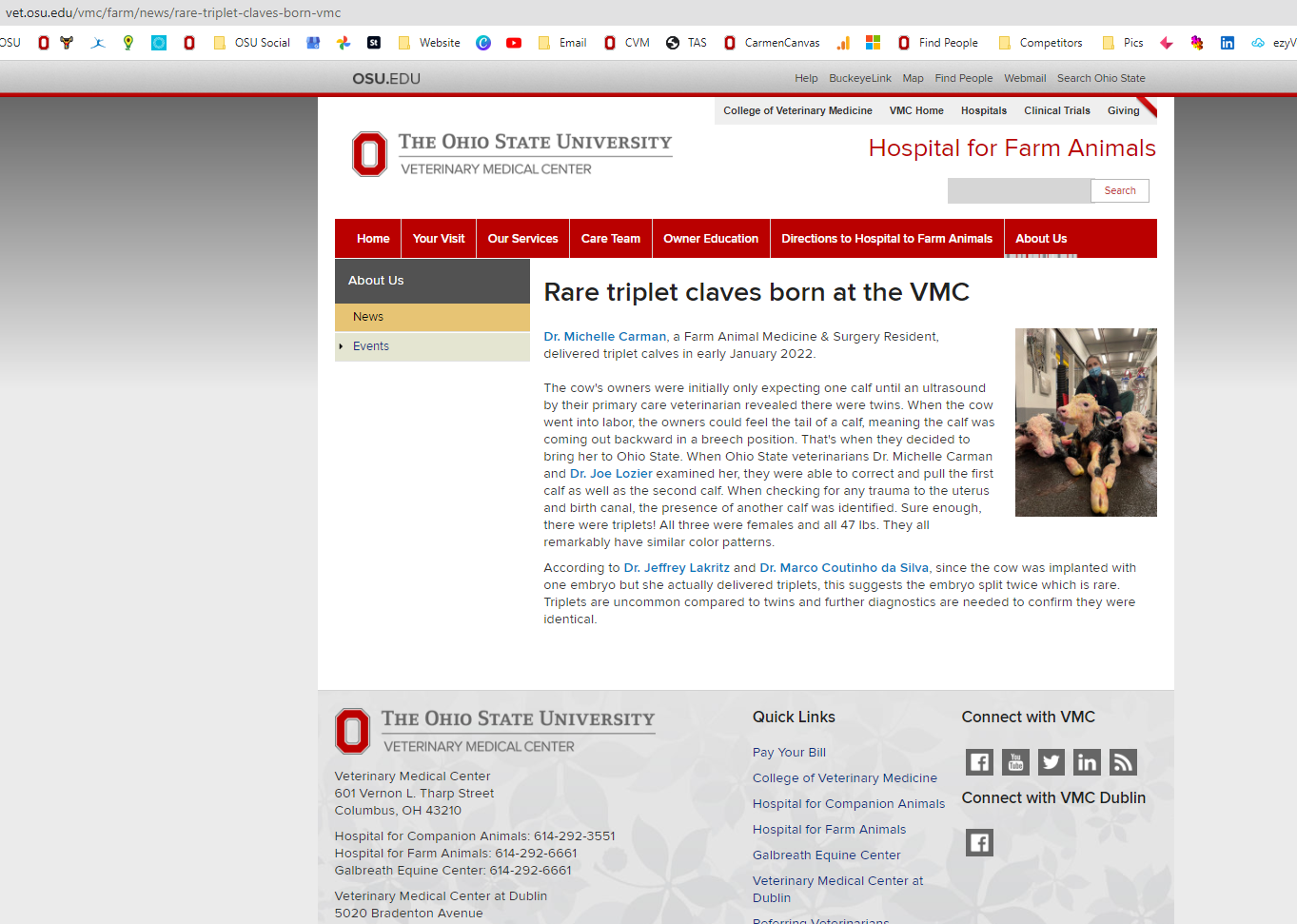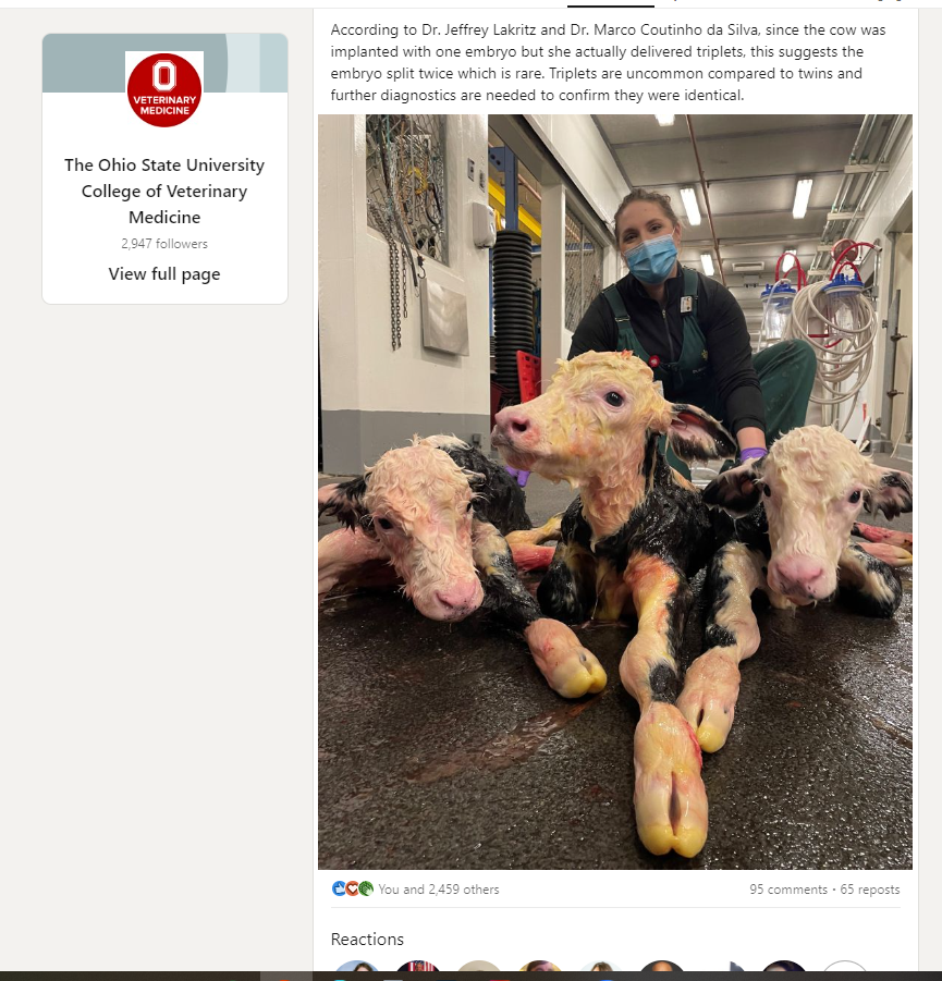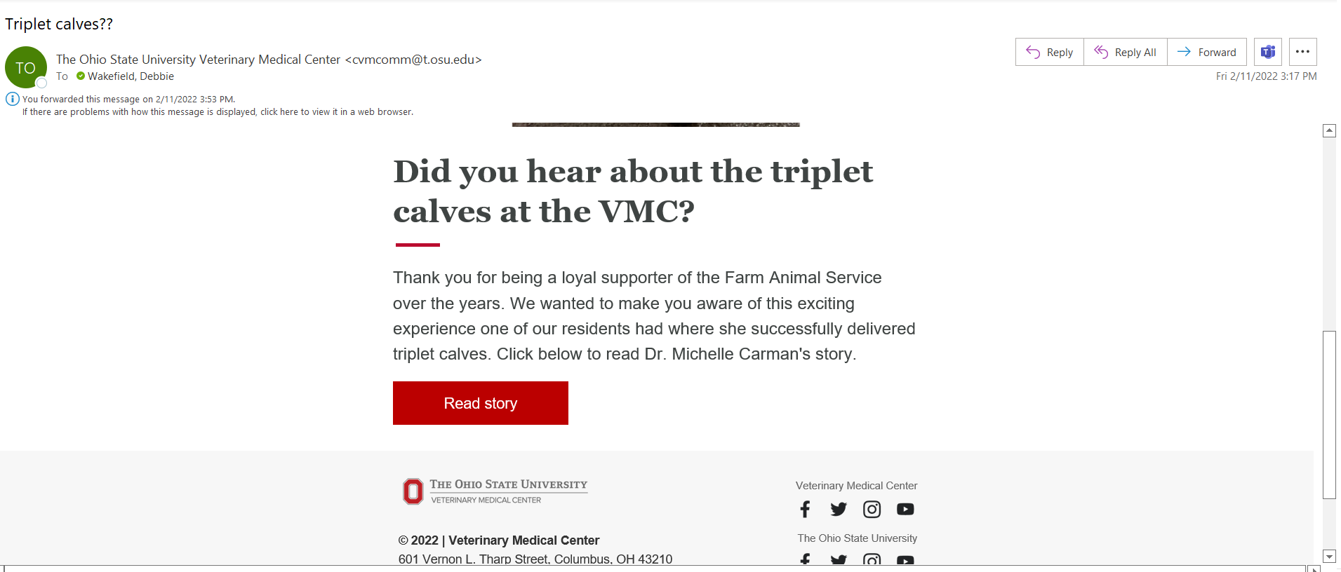 I managed a viral social media post in January 2022 at The Ohio State University College of Veterinary Medicine. I worked with stakeholders to find out about the calves being born. I summarized the information, crafted a draft, and showed the doctor to ensure that the content was accurate. When the post went viral, I immediately shared metrics. The post had 264,628 engagements on the VMC FB, 2,129 engagements on IG, and 5,465 engagements on LinkedIn. The post was shared in our alumni email newsletter called Connect, the Veterinary Medical Center Newsletter, and in a Farm Animal donor email.