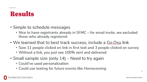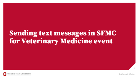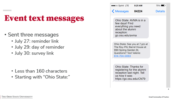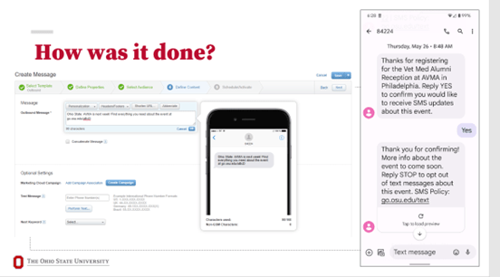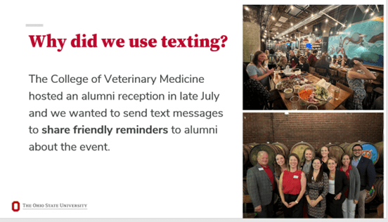 I spoke about our experience using Salesforce Marketing Cloud to send text messages to alumni attending an alumni reception in Philadelphia, for the AVMA conference. I was transparent sharing that we had a small sample size and that we struggled to track our success with text messages.