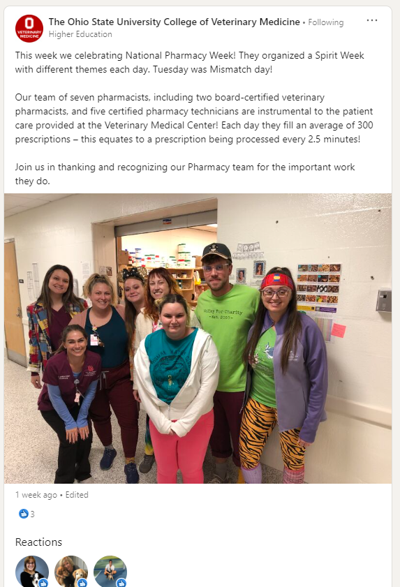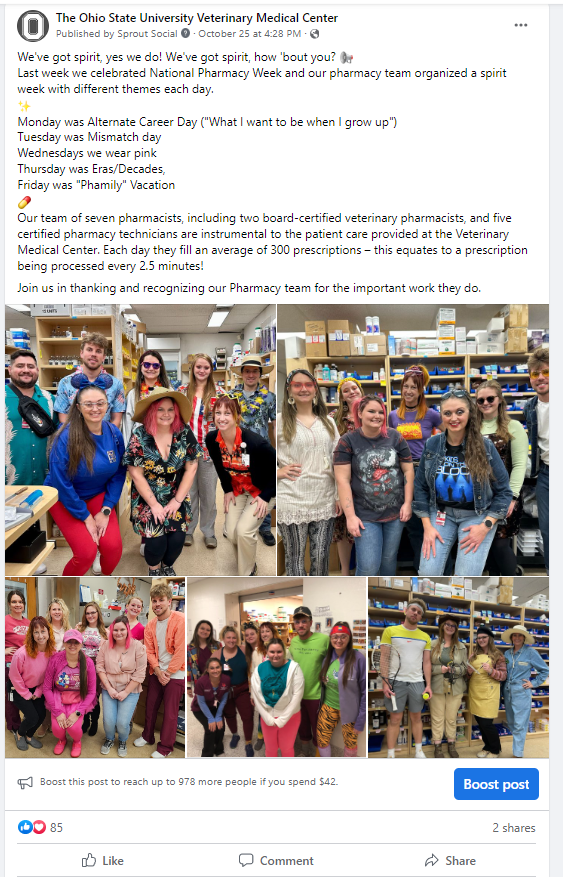 I recently tried sharing photos from the spirit week organized by the pharmacy team at Ohio State’s Veterinary Medical Center. I knew it was National Pharmacy Week and wanted to share something so I walked over to the pharmacy to take a group photo. To my surprise, everyone was dressed really wacky that day. They told me about their spirit week and how they had different fun outfits all planned out. Their team then emailed me more photos from each day of the week. I shared the photos across our social media channels and the post was our top post on the VMC Facebook page for October!