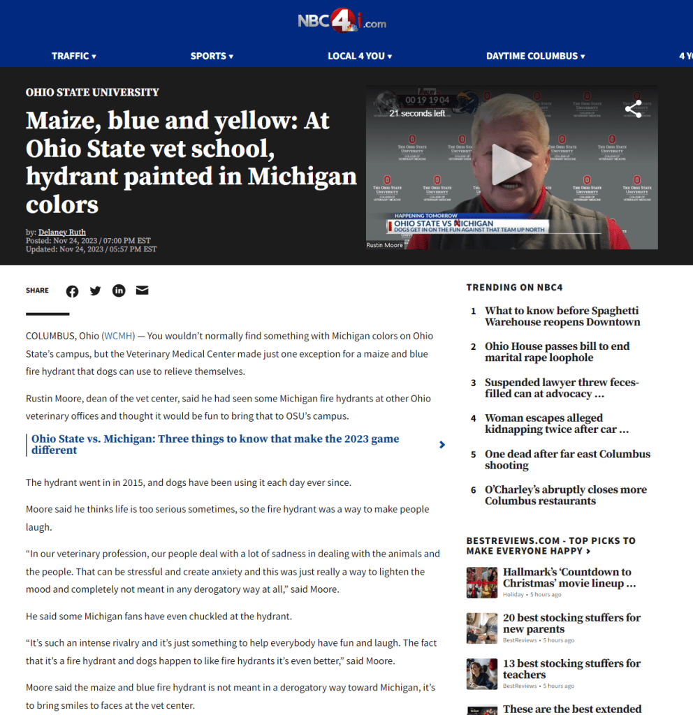 Packing her camera up, the journalist casually said to me, “And I’ll just be back on Friday to get a live shot. I’m sure someone can let me back here.” Um, what? I told her I needed to check with our media relations person and called Allison. Allison said that Friday was observed as a holiday at Ohio State and a media trained staff member wouldn’t be able to accompany her, so she couldn’t come back on Friday. I hung up with Allison and told the journalist that she wouldn’t be able to come back Friday and asked if she could pre-record her intro and outro now. She said she could, she’d just need to write the copy then and there. We went back out to the fire hydrant and she filmed a brief intro and outro. I stayed nearby, listened, and texted with Allison. The journalist packed up and left the veterinary hospital.