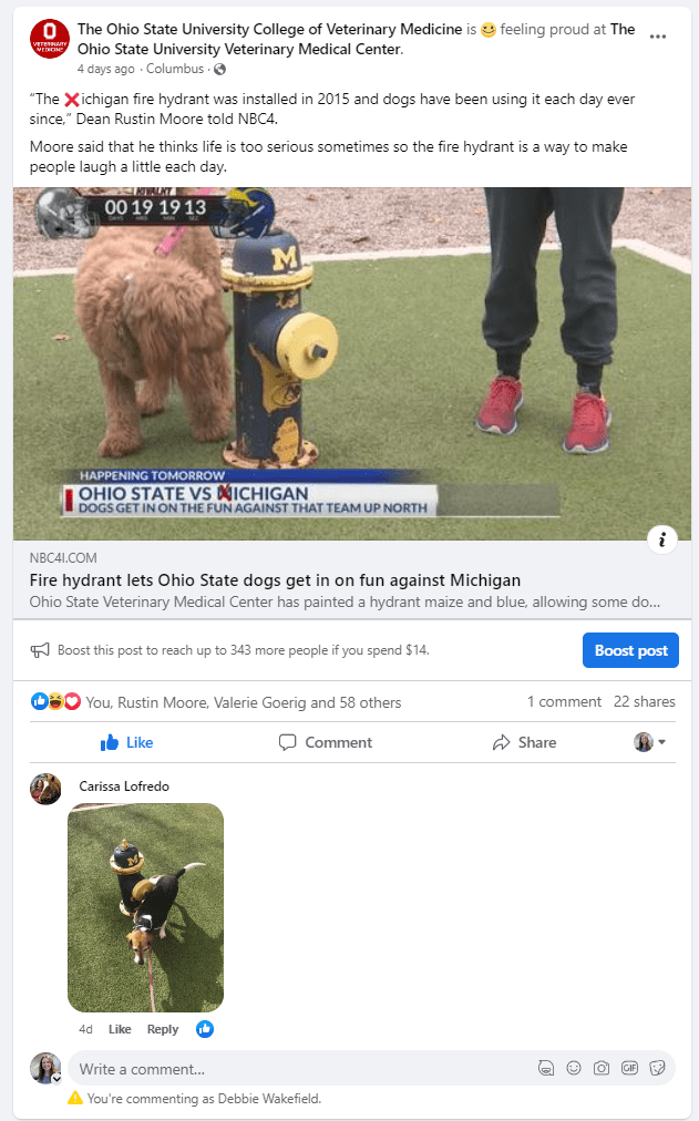 I don’t do a lot of media relations in my current role but it’s always interested me, especially since I was previously on the other end, working as a small time local reporter for a print newspaper. I like when I get whatever public relations experience I can get. And I got a kick out of my own dog, Holly, fulfilling an Ohio State dog’s dream.