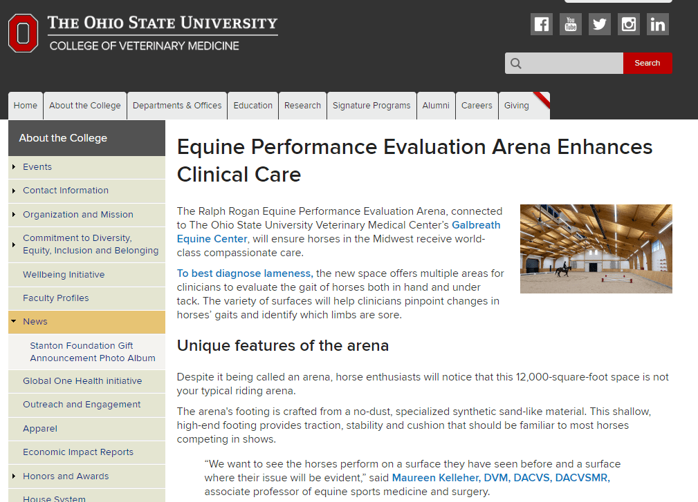 Goal of the article: Inform Ohio horse owners why this new arena enables the Sports Medicine clinicians to perform superior performance evaluations. I focused the article on how before the arena was built, clinicians had to evaluate horses in a dark, small hallway.
