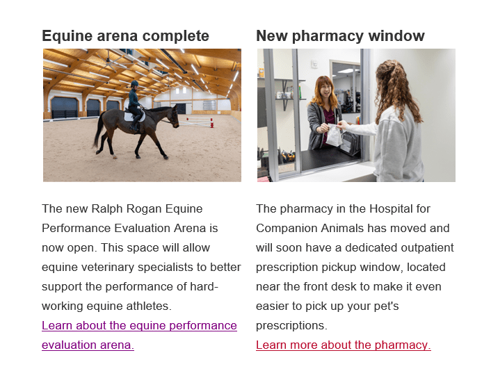The article was shared on the Veterinary Medical Center website and the College of Veterinary Medicine website, on social media channels, and in email newsletters (including a client newsletter that went to an audience over 50k.)