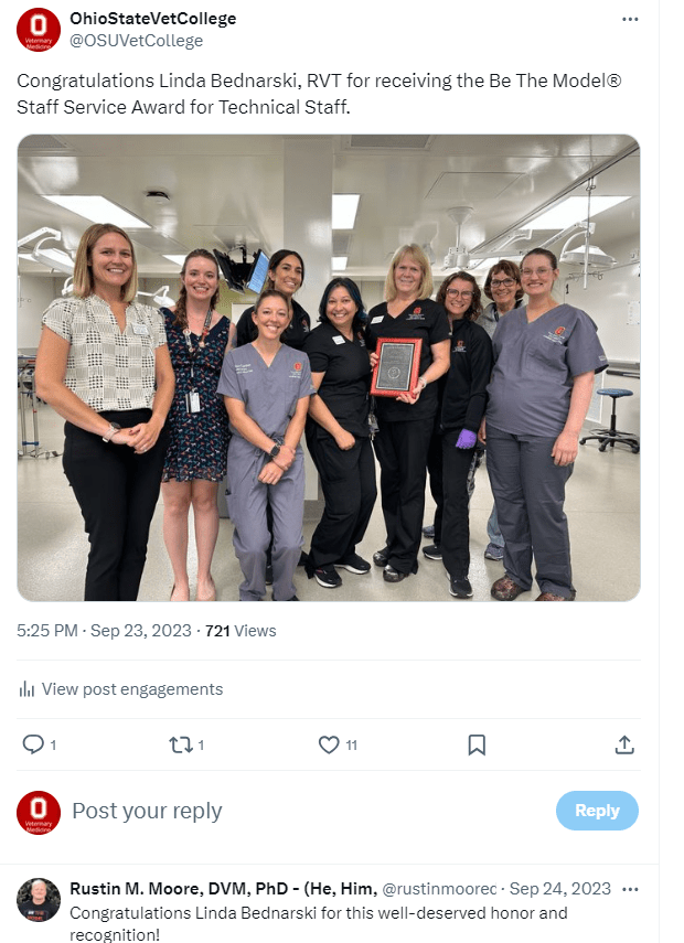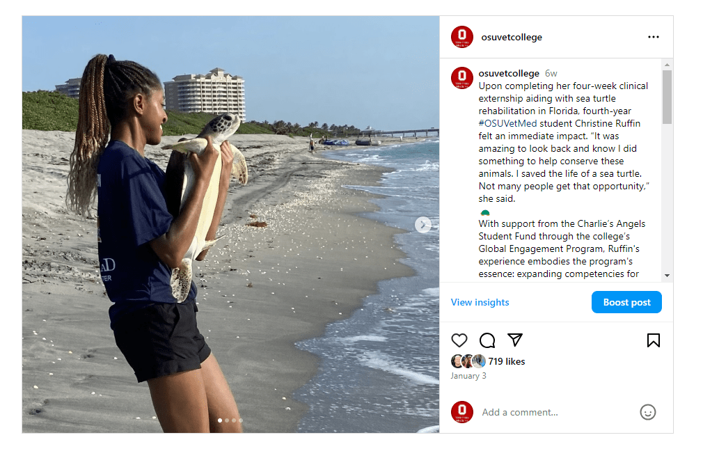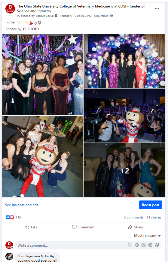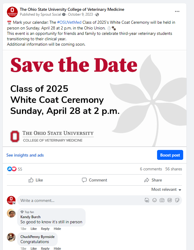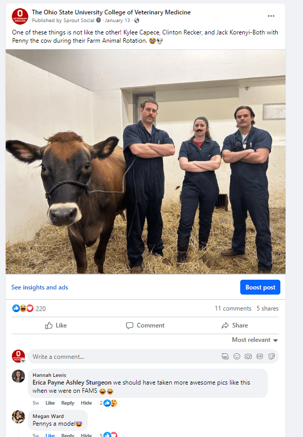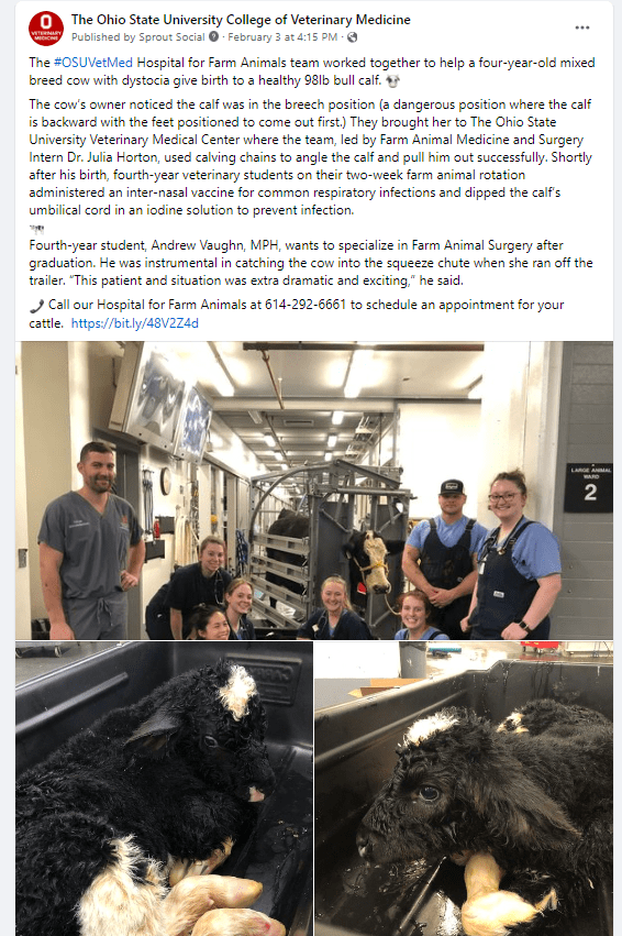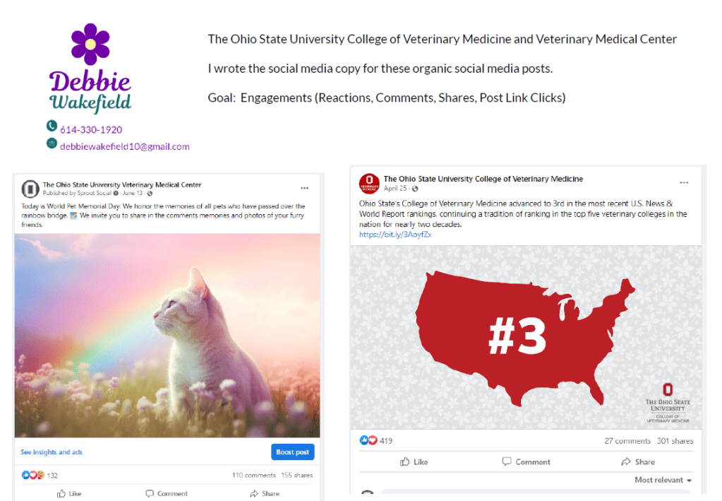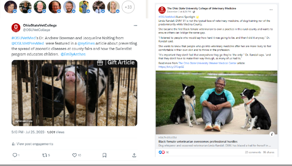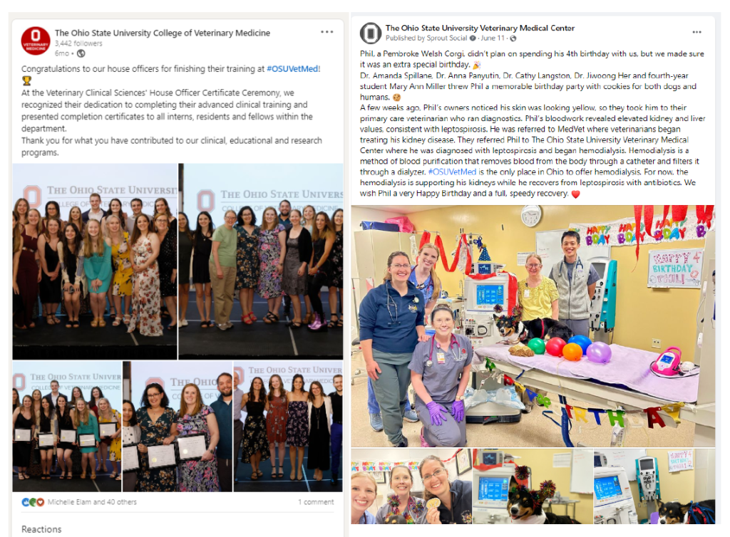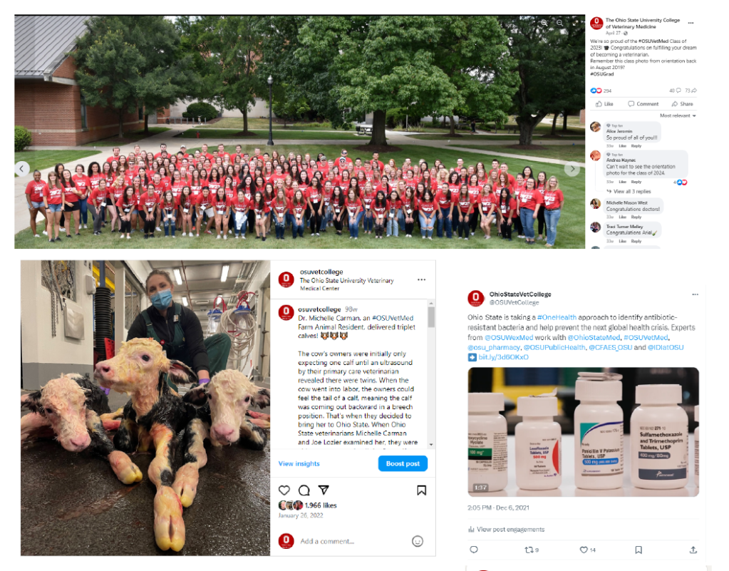 These are examples of social media posts I created for The Ohio State College of Veterinary Medicine’s Facebook, LinkedIn, Twitter, Instagram and the Veterinary Medical Center’s Facebook.