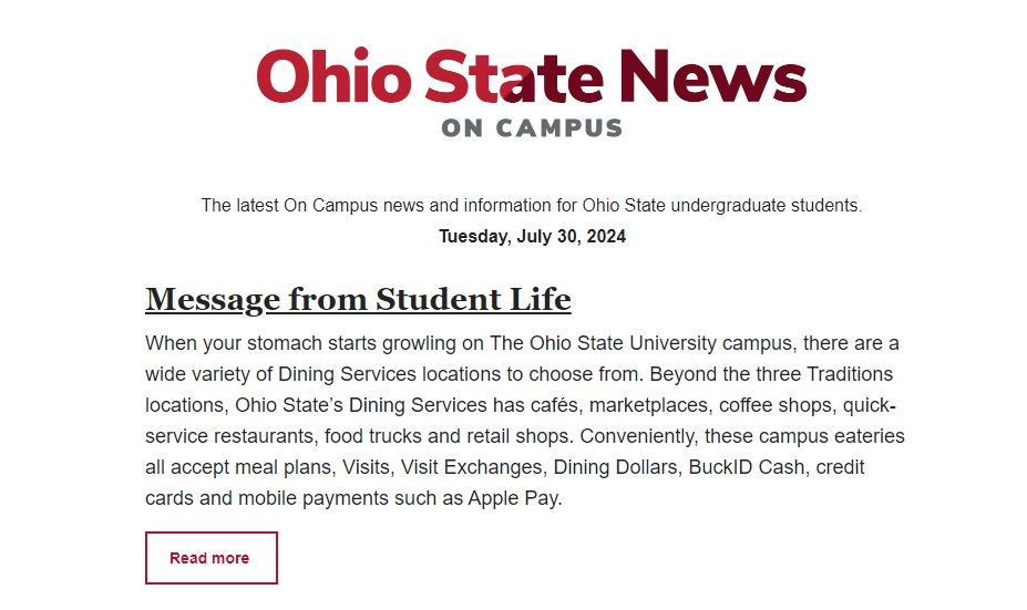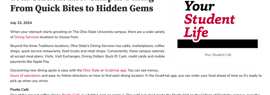 I wrote this article about Dining Services (one of the five clients I provide marketing support for within the Office of Student Life at The Ohio State University) and it was featured in the university-wide email On Campus and on the Student Life homepage.