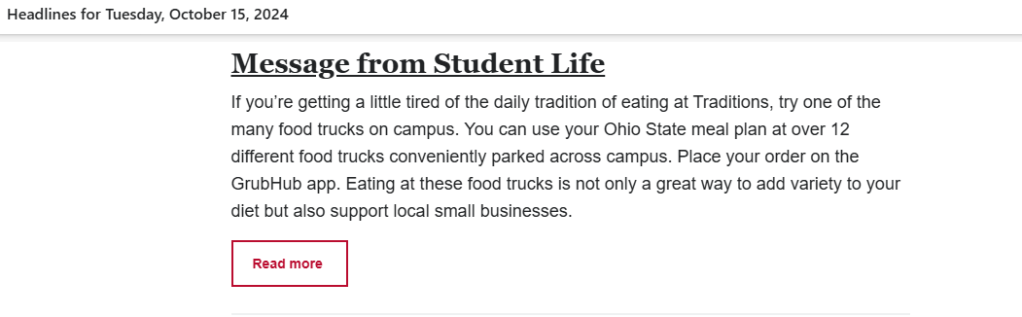 I wrote this article for Ohio State’s Dining Services to encourage students to eat at one of the many on-campus food trucks. This article came about after I finished working with Student Life Technology Services to create a webpage that published food truck locations and schedules. I wanted students to find that resource. The food trucks on campus are confusing so I hoped the article and webpage to spell out in plain-English some of the nuances of the trucks (like yes, they take meal plans).