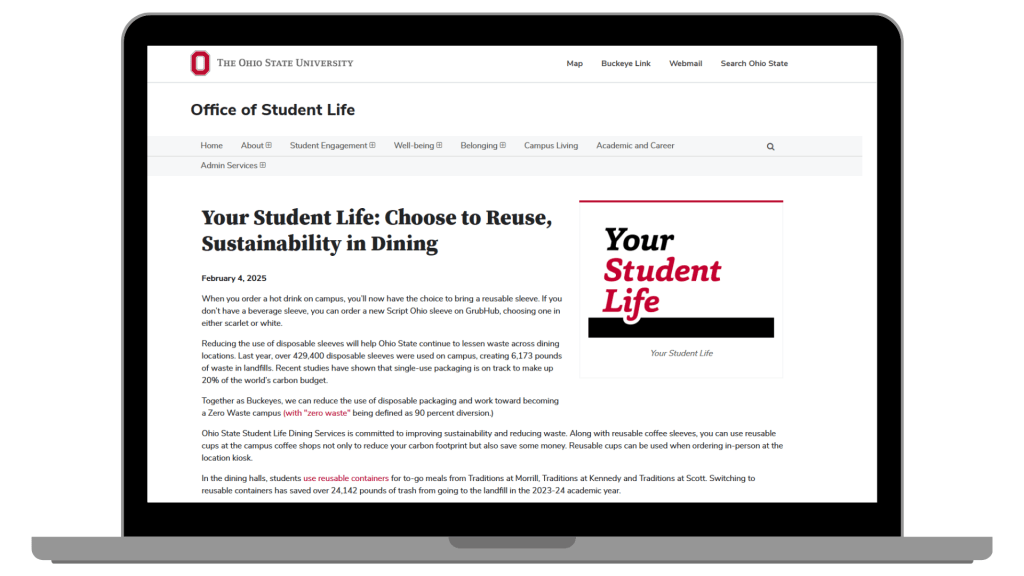 This article is part of the larger reusable coffee sleeves campaign which included social media graphics, website headers, features in the OSU App, Parent and Family newsletter feature and more.