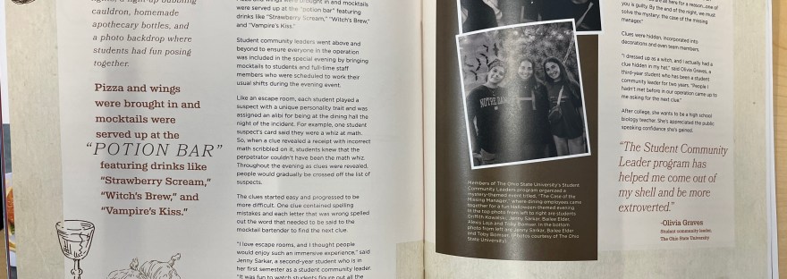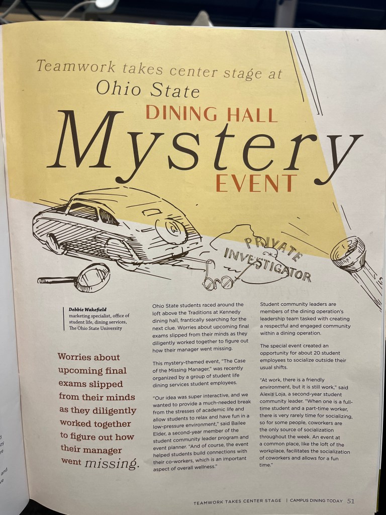 How: I joined the marketing committee of NACUFS, learned about the upcoming theme of the issue: Student Engagement. I brainstormed a few article ideas and asked OSU dining leaders for article suggestions. The director told me about how students had organized an engaging murder mystery evening for fellow student employees. I emailed the program director, contacted the students, interviewed them, wrote the article, submitted the article for internal edits then sent the article off.