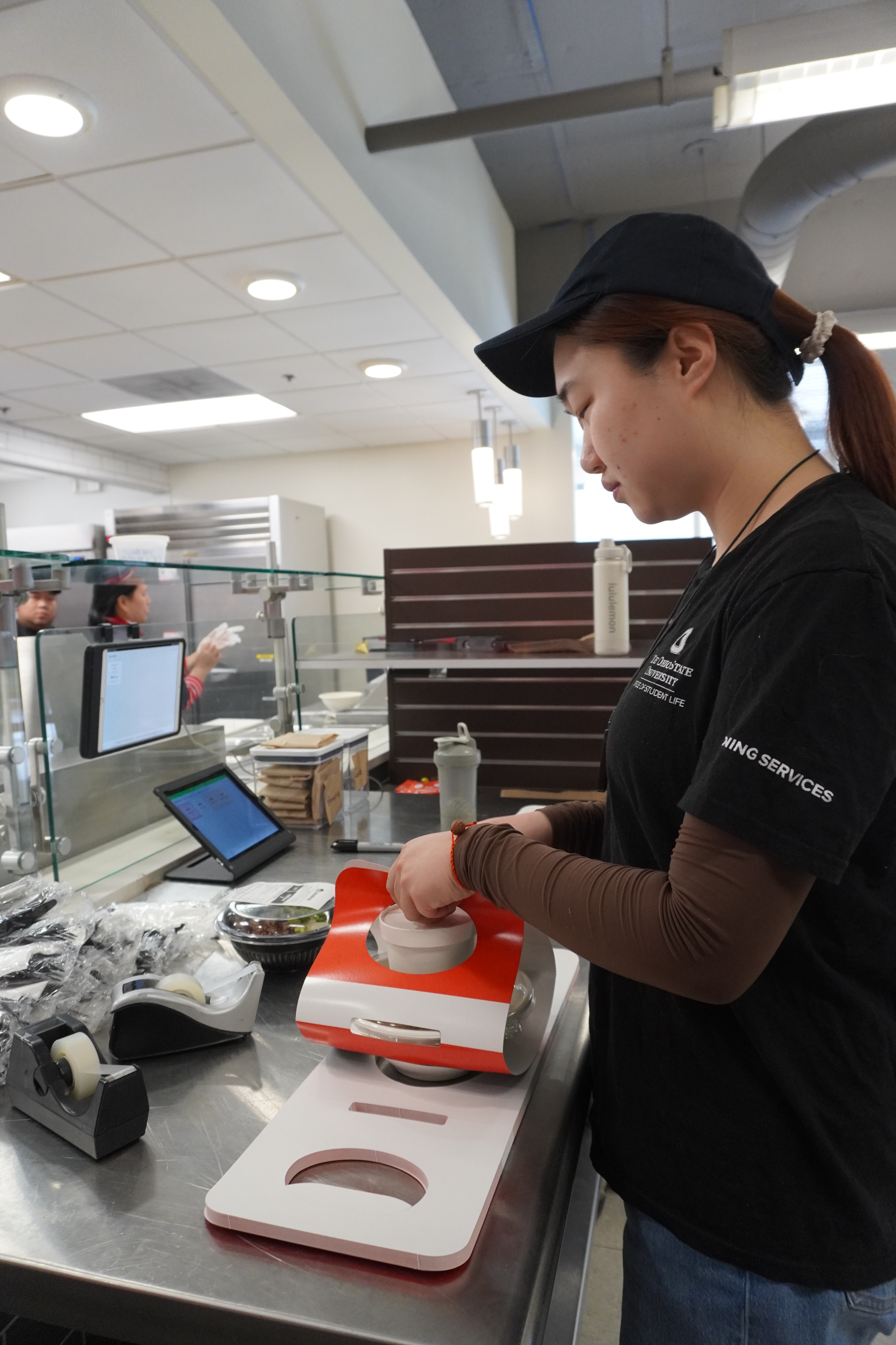 Student employees wrap the carryout container around the bowl and broth, securely stapling it shut along with the customer pick-up ticket. This process takes less than 15 seconds, leading to faster ticket times. The efficiency of this system has been a key factor in its success, allowing students to order their ramen, then quickly grab their meal and go.