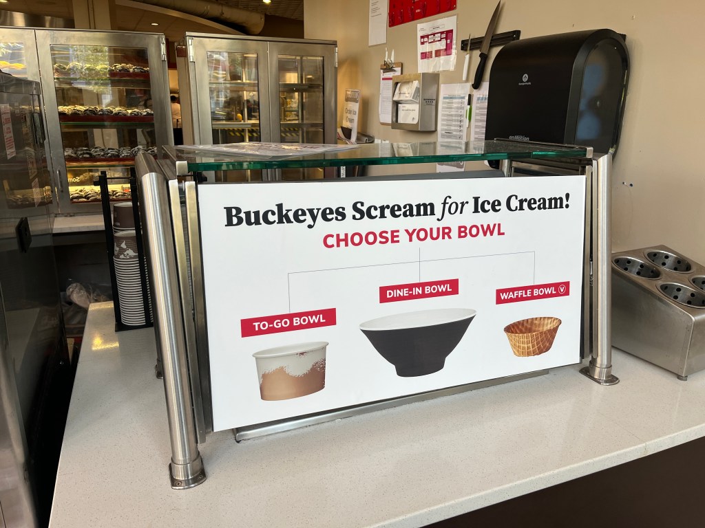 For the choose-your-bowl signage, I wanted to visually show three different types of bowl options. Students can choose a black bowl for dine-in, a disposable paper cup for to-go or a waffle bowl. I wrote the copy, “Buckeyes Scream for Ice Cream.”