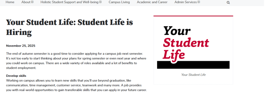 The end of autumn semester is a good time to consider applying for a campus job next semester. It’s not too early to start thinking about your plans for spring semester or even next year and where you could work on campus. There are a wide variety of roles available and a lot of benefits to student employment.