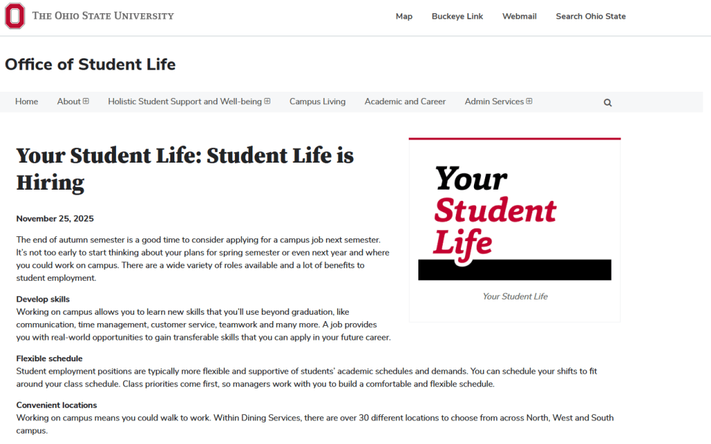 In late November, I wrote an online piece for The Ohio State University Office of Student Life about the benefits of student employment, specifically within Dining Services. The piece was part of the weekly Your Student Life feature which is included in the email newsletter onCampus Today that goes to all undergraduate, graduate and professional students. The article is also up on the Student Life website.