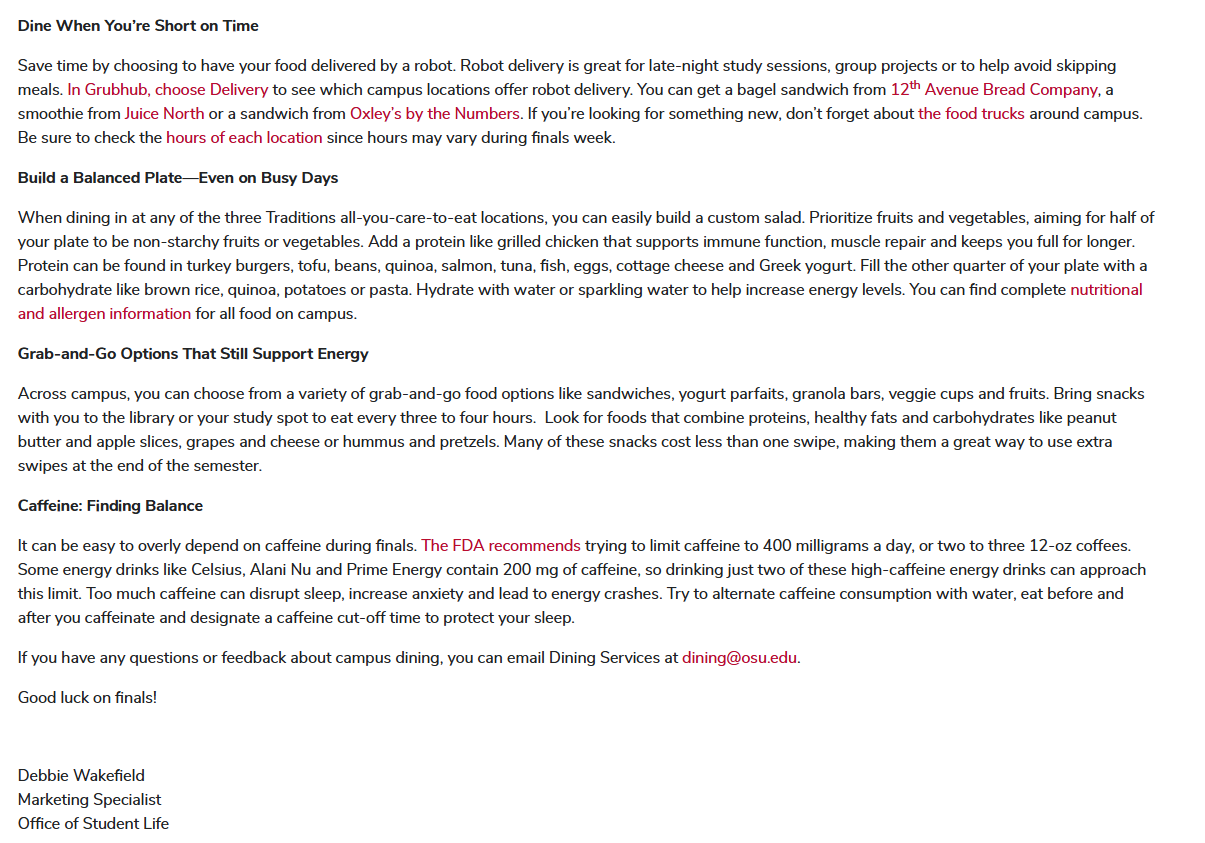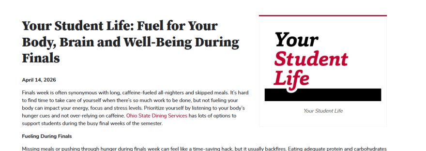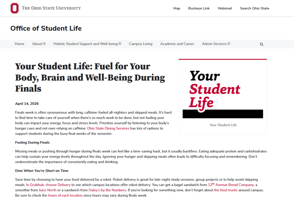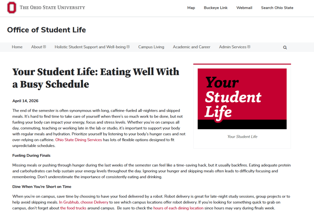 I wrote an online article about how Ohio State students can eat healthy during the busy end of the semester. This article is part of the Your Student Life series of articles that are featured in onCampus Tody email newsletter that goes to all students.